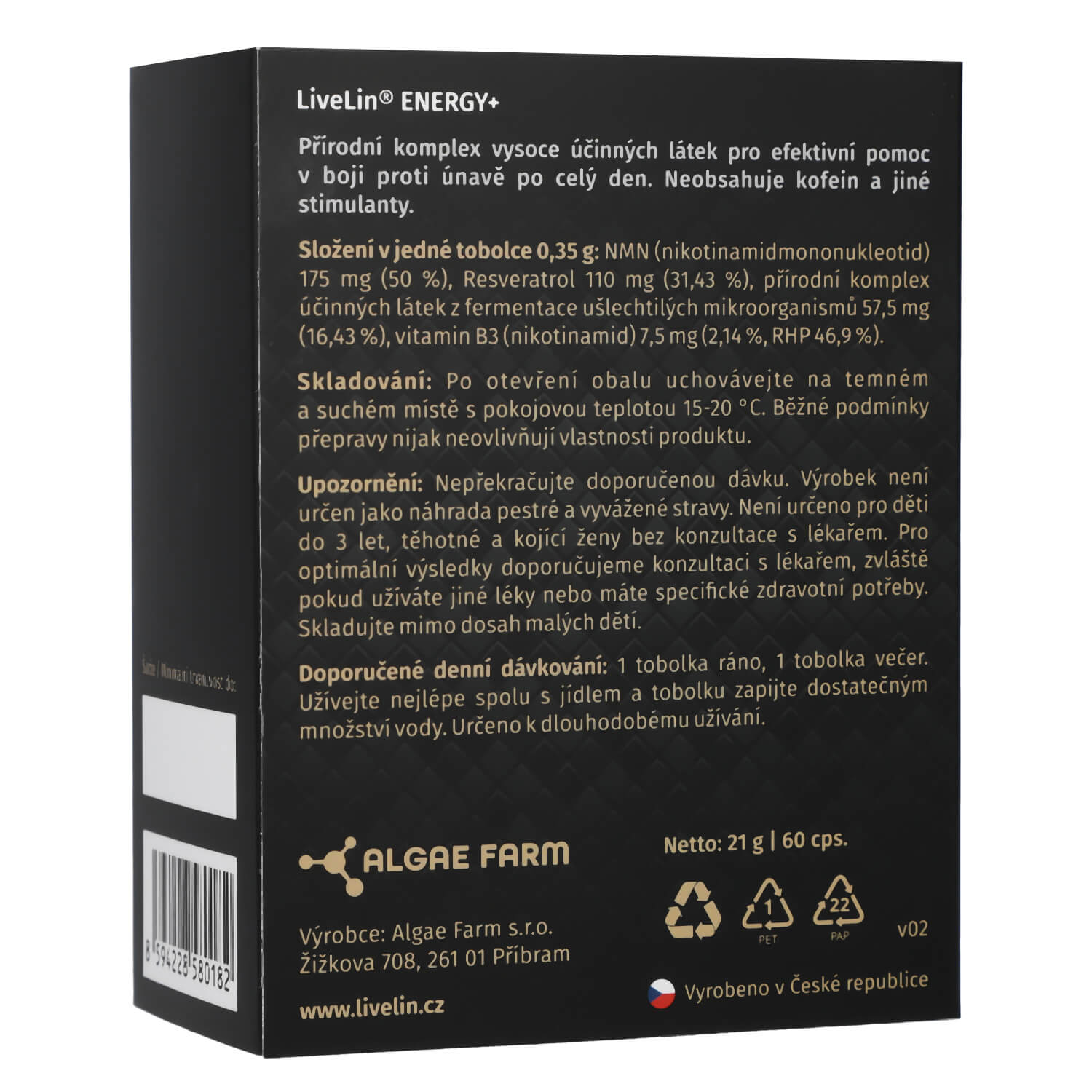 LiveLin® Energy+ wurde als Komplex hochwirksamer Substanzen mit hoher Absorbierbarkeit und synergistischer Wirkung der einzelnen Inhaltsstoffe entwickelt. Bei langfristiger regelmäßiger Einnahme liefert es eine stabile Energiequelle für den gesamten aktiven Tag. Es unterstützt die energetischen biochemischen Prozesse, die die Energie aufrechterhalten und Müdigkeit reduzieren. Im Gegensatz zu ähnlichen Produkten enthält es weder Koffein noch andere Stimulanzien und verursacht daher keine Energie- und Stimmungsschwankungen, Reizungen des Verdauungstraktes oder andere negative Nebenwirkungen wie Nervosität, Herzklopfen, schnelle Schwankungen des Blutzuckerspiegels usw.