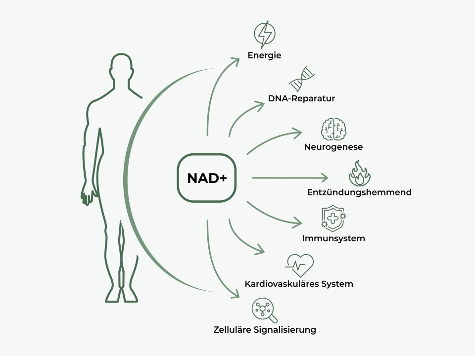 Insgesamt sind diese Moleküle entscheidend für die Aufrechterhaltung des Energiegleichgewichts und der Zellgesundheit. Ein Rückgang des NAD+-Spiegels im Körper wird mit dem Alterungsprozess und bestimmten Krankheiten in Verbindung gebracht. Aus diesem Grund steht NAD+ im Mittelpunkt der Forschung über Alterung und Zellregeneration.