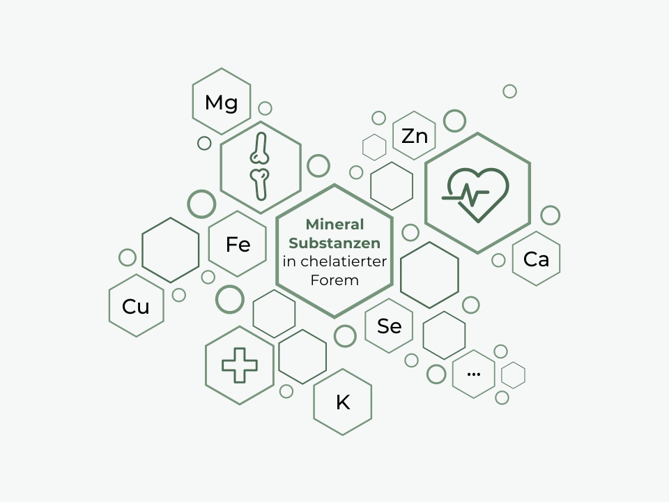 Nahrungsergänzungsmittel mit Mineralien und Spurenelementen in der sogenannten Chelatform gelten als am wirksamsten. Diese Form weist die höchste Absorption und Bioverfügbarkeit auf.