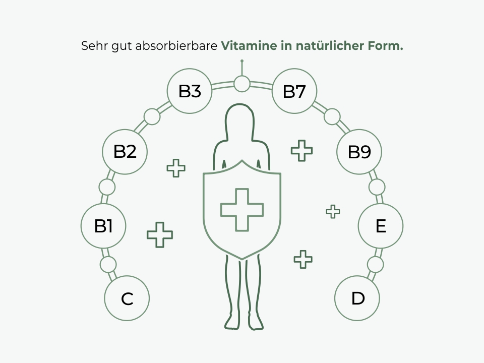 Im Gegensatz zu wahllos gemischten Multivitaminpräparaten enthält LiveLin nur gut absorbierbare Vitamine in natürlicher Form: C, B1, B2, B3, B7, B9, E und Provitamin D.